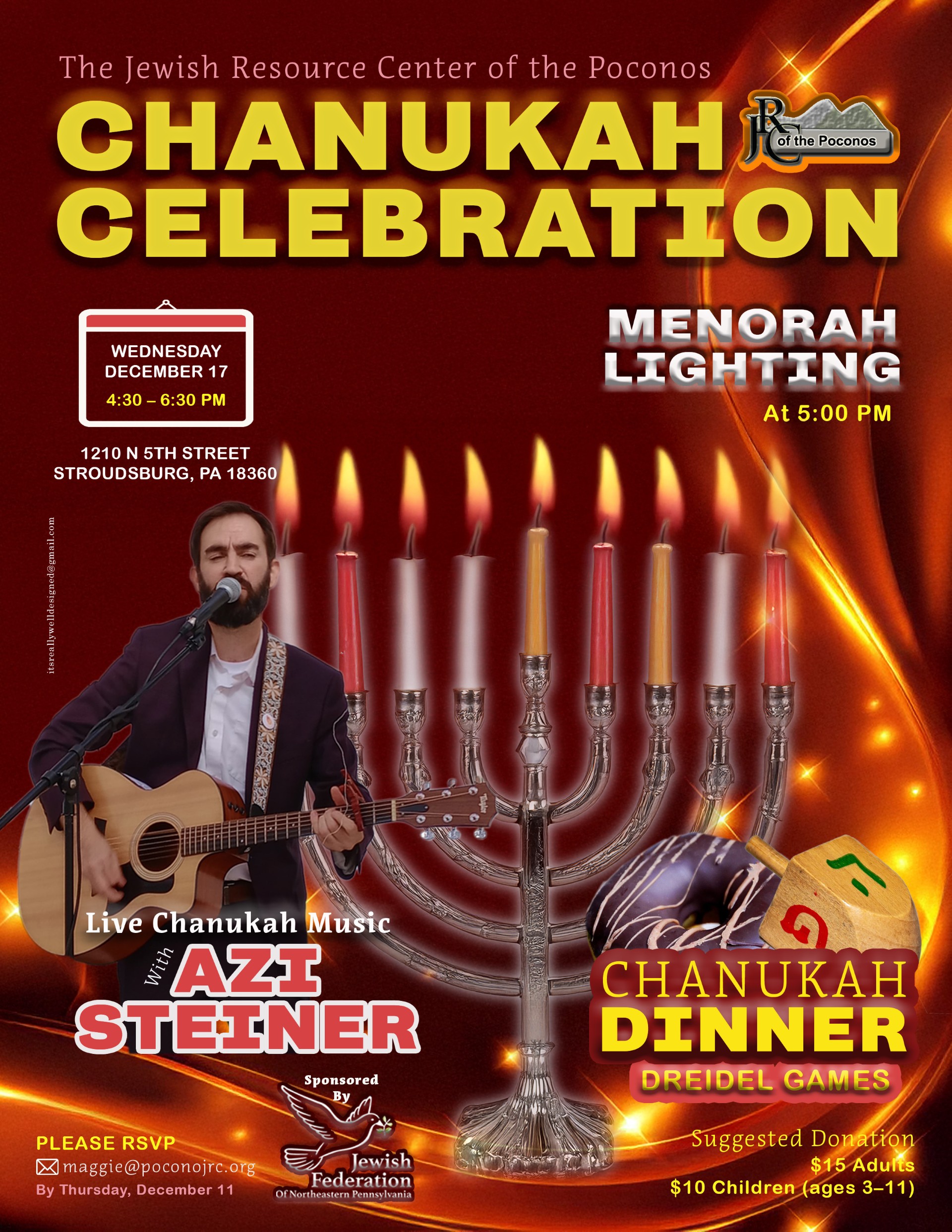 Join us on Wednesday, December 17th between 4:30 pm - 6:30 pm for a delightful Chanukah celebration! Sponsored by the Jewish Federation of Northeastern Pennsylvania.